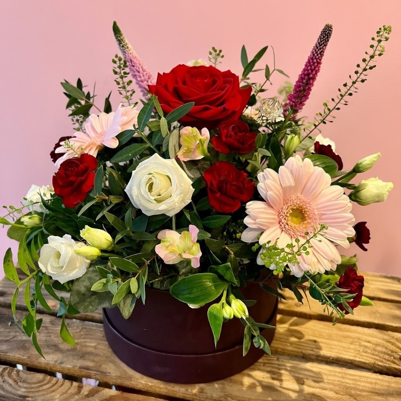 Romantic reds, cerise and pinky shades, arranged by our in-house team of florists.