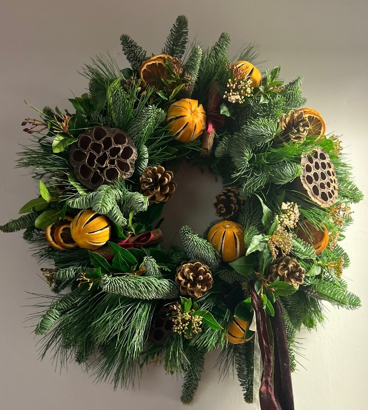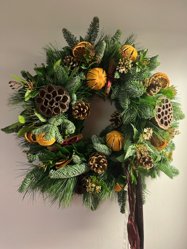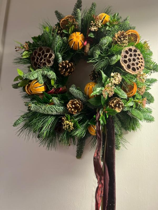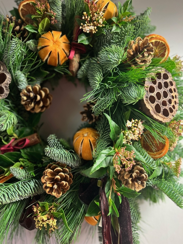 A Christmas Door wreath with seasonal foliage and decorated with, Orange slices, Pinecones, Cinnamon Sticks, Seed heads and red ribbon bow. A great way to dress up your door for a traditional Christmas feel.