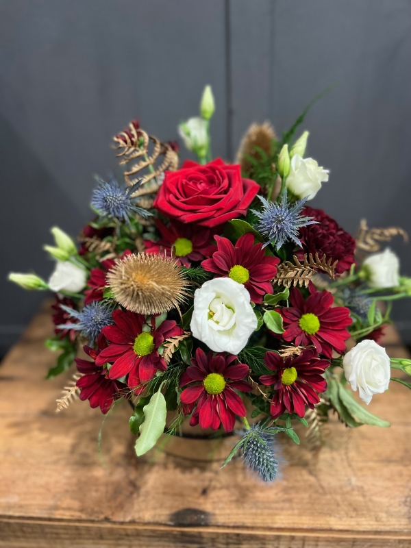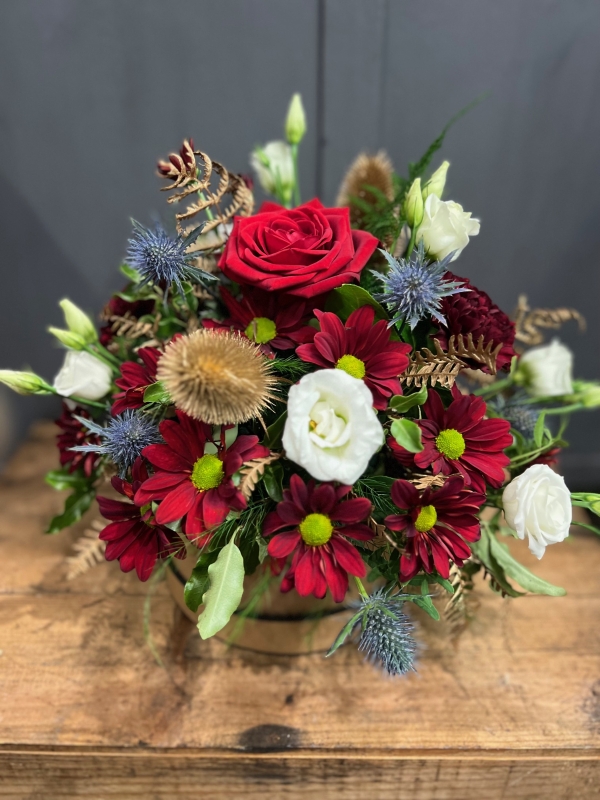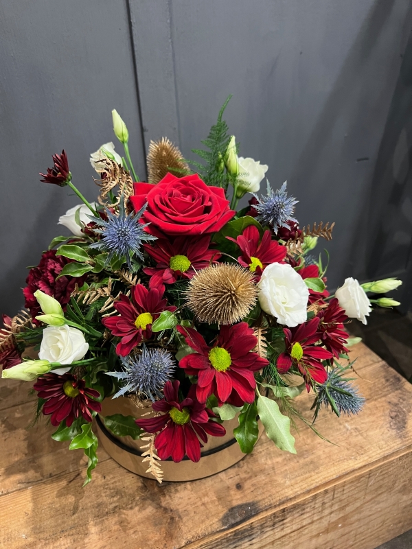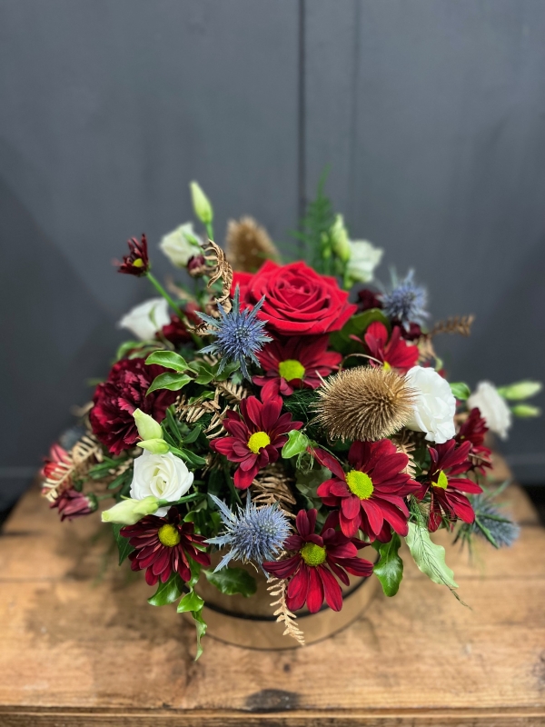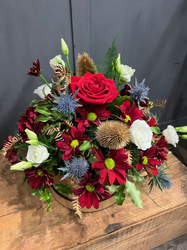 A beautiful festive arrangement including festive reds & whites, with Thistle, pinecones, and festive foliage. This design is arranged in biodegradable oasis and presented in a Kraft paper hatbox. It's the perfect gift if you're looking for a no fuss, easy care floral design.