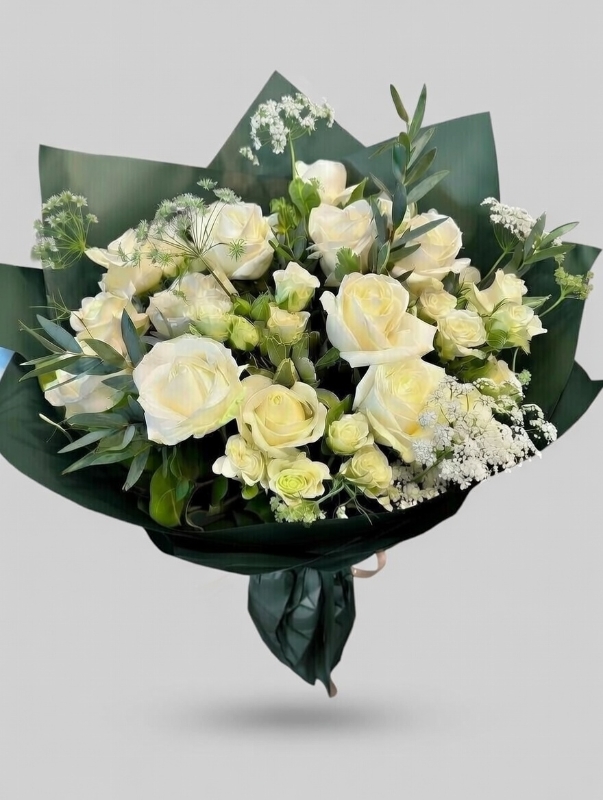 A stunning bouquet of white roses, and spray white roses arranged in a water bubble and box . We will use a  lovely kraft  paper to tone in.