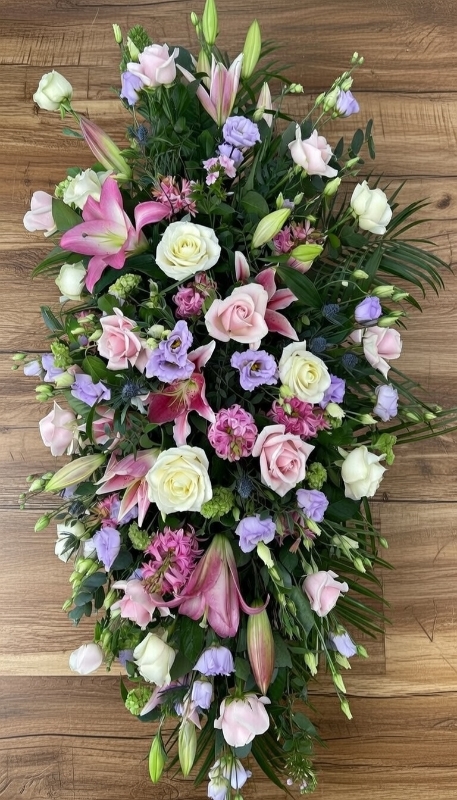 A stunning "choice" casket spray of pink and white Roses are arranged with stunning pink Oriental Lily, blue Eryngium, lilac Lisianthus and other stems to tone, and a selection of foliage to create this beautiful casket spray.