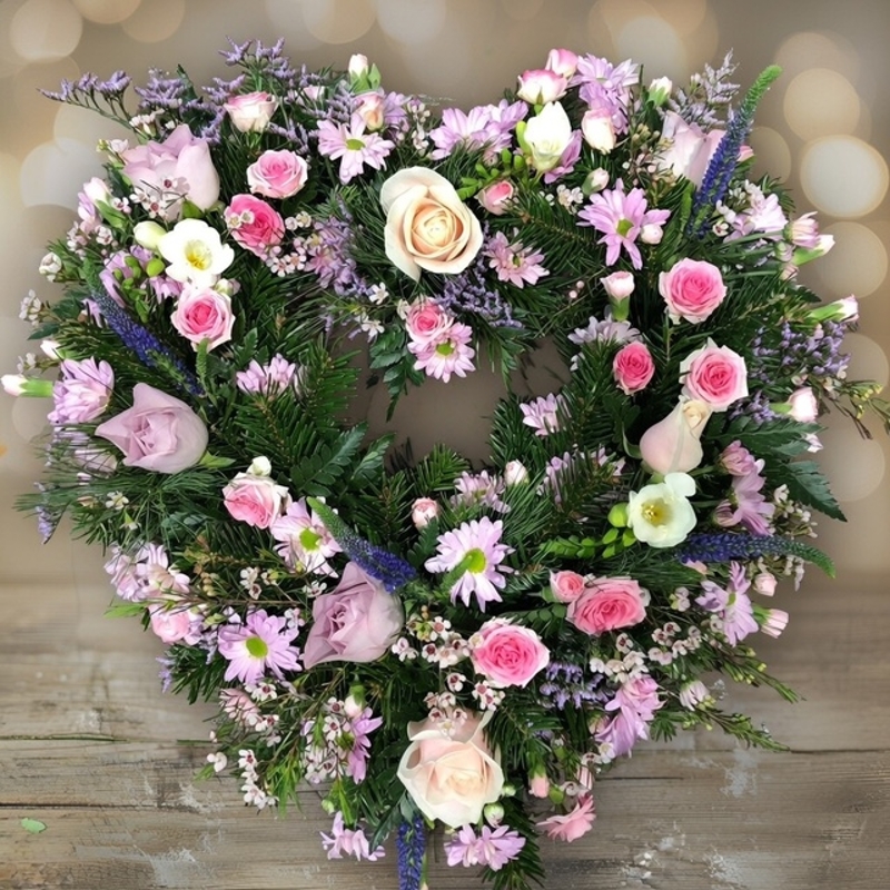 This pretty loose style open heart tribute, pretty pinks and lilac/purple shades.
