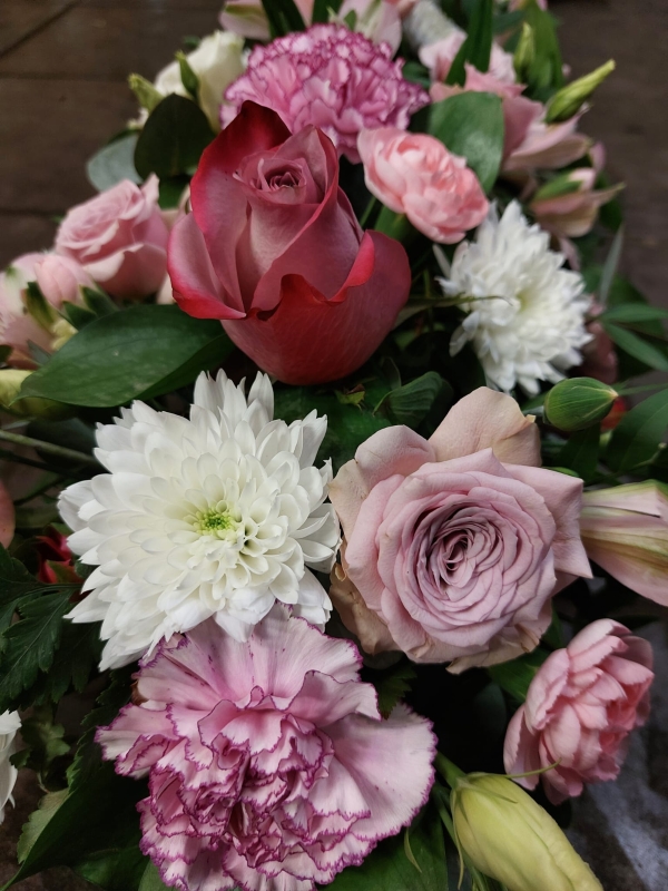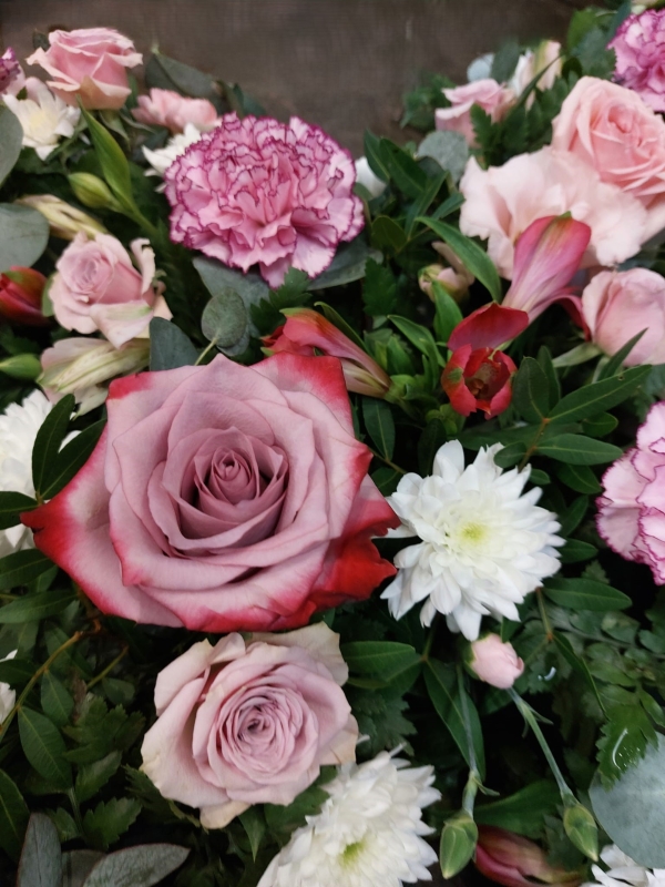 Beautiful pink and cream shades, loose style cross. Less formal than a white based cross tribute.